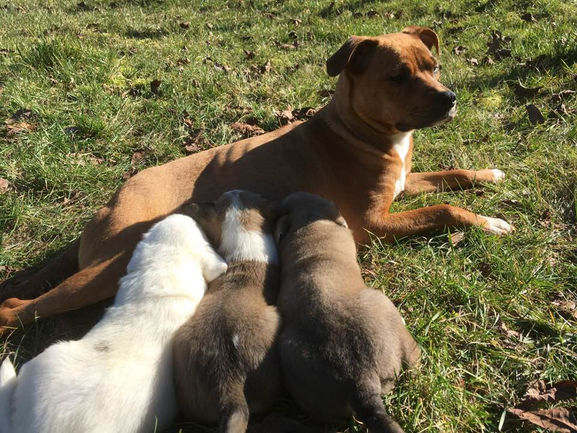 ANIA rebaptisée KYRA a été adoptée le 29 août 2019 par Valérie, Thomas et leurs enfants Sacha et Zoé. ANIA, femelle, type croisée Boxer (estimation vétérinaire), fauve et plastron blanc (non LOF). Née le 1 janvier 2015 (estimation vétérinaire). Elle est maintenant pucée, vaccinée, stérilisée et déparasitée interne et externe. Elle a été stérilisée (ovario-hystérectomie) le 5 mars 2019. Elle est maintenant à l'adoption, ses 3 chiots (Pakita, Poupy et Pongo) ayant été adoptés. UPDATE 14 avril 2019. ANIA est une chienne adorable, douce et encore un peu craintive. Ok chiens et chats. Mars 2019. ANIA vient d'arriver en famille d'accueil avec ses chiots. Entente et caractère en cours d'étude. Elle a passé plus de 3 mois en fourrière alors il va falloir la laisser se dévoiler doucement et la laisser se poser. Elle semble douce et gentille et très reconnaissante. En famille d'accueil dans le 28130 (Eure et Loir). L'histoire de ANIA: Elle a été trouvée errante, non identifiée (et enceinte mais on l'a découvert plus tard) et sans collier le 19 novembre 2018. Elle est restée en fourrière plus de 3 mois et ses 7 bébés sont nés le 16 janvier. Seuls 3 ont survécu. Elle est sortie de fourrière sous LADM le 3 mars 2019. Un énorme merci à la fourrière d'avoir gardé ANIA et ses bébés au delà des 8 jours ouvrés... ANIA est sous contrat Les Amis de Mademoiselle. Téléphone : 06 09 76 61 77 (Merci de laisser un message clair et précis avec vos coordonnées). Adresse électronique : lesamisdemademoiselle@wanadoo.fr Les frais d'adoption sont de XXX €, identifiée par puce électronique, vaccinée ( (passeport et vaccination anti rabique inclus) et stérilisée. Au contrat d'adoption sera joint un certificat vétérinaire obligatoire avant toute cession (code rural L214-8 et D 214-32-2).