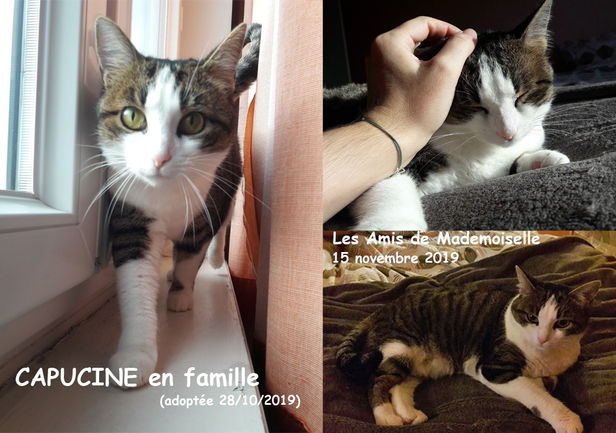 CAPUCINE a été adoptée le 28 octobre 2019 par Christelle et Thomas. CAPUCINE, femelle, type Européen, tigrée et blanche. Née le 01/04/2018 (estimation vétérinaire). Elle est maintenant pucée, vaccinée (rappel fait le 12 juillet 2019) et stérilisée. Test fiv et leucose négatif. Elle pèse 3,55 kilos le 14 juin 2019. Elle pèse 4,150 kilos le 13 juillet 2019. CAPUCINE est une petite chatte adorable, timide, douce et un peu craintive mais très vite sociable et câline quand elle est rassurée. Elle semble avoir peur des grands chiens alors dans sa famille d'accueil elle reste enfermée dans une dépendance. Elle pourra certainement s'entendre avec un petit chien calme et respectueux avec un peu de temps. CAPUCINE espère vite vite vite trouver une famille. Elle aura besoin de sortir à l'extérieur, une maison avec jardin semble indispensable (mais avec une période de sécurité dans la maison). Mais un appartement avec sortie balcon ou terrasse sécurisés anti chutes peut suffire car depuis son sauvetage en juin 2019 elle reste en intérieur maison et le supporte très bien sans réclamer de sortir. Elle aime bien son petit confort et elle est très gourmande. En famille d'accueil dans le 28130 (Eure et Loir). L'histoire de Capucine : LADM l'a sortie de fourrière le 11 juin 2019. Elle avait les tétines gorgées de lait à la limite d'une mastose. Elle a été stérilisée tout de suite. Ses 4 chatons (Nanook, Pépito, Pacha et Réglisse) ont été ramassés par la fourrière 10 jours après et ils ont rejoint leur maman. Ils avaient été nourris par une dame entretemps, ils étaient un peu maigres mais vivants !!! CAPUCINE est sous contrat Les Amis de Mademoiselle. Téléphone : 06 09 76 61 77 (Merci de laisser un message clair et précis avec vos coordonnées). Adresse électronique : lesamisdemademoiselle@wanadoo.fr Pour faciliter son adoption, les frais d'adoption sont en DON LIBRE sous conditions d'adoption (inclus une participation aux frais vétérinaires) identifiée par puce électronique, vaccinée, testée FIV/Felv et stérilisée. Au contrat d'adoption sera joint un certificat vétérinaire obligatoire avant toute cession (code rural L214-8 et D 214-32-2).
