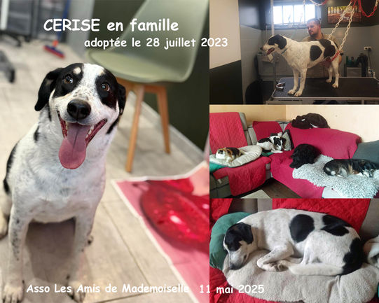 CERISE a été adoptée le 28 juillet 2023 par Sylvie et Jean-Pierre. Elle a rejoint Ava et Marlon eux aussi adoptés chez LADM.