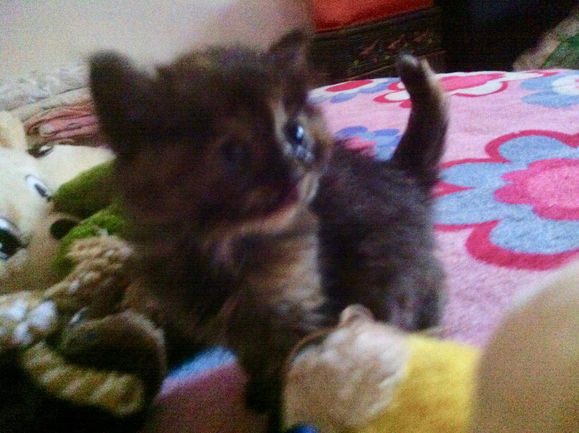 L'histoire de LULUBELLE : le 10 septembre 2015, en début d'après midi, je fais quelques courses à Epernon. Coup de fil du cabinet vétérinaire, 4 petits chatons d'environ un mois ont été amenés chez le véto. Ils ont été récupérés en urgence par deux jeunes filles, chez un particulier ... ce charmant monsieur laisse faire des portées entre le mâle et la femelle et met ensuite les chatons sur le balcon... un était mort et les 4 autres pleuraient depuis plusieurs jours de faim et de froid...Les jeunes filles ont fait le forcing pour les récupérer pour les amener chez le vétérinaire... Comment dire non, comment refuser la prise en charge de ces petits anges ? Donc je prends les 4 bibous, 4 pipettes de Stronghold pour puces et vers et en route pour Soulaires... Les 3 petits gris ont l'air assez vigoureux, mais la petite écaille de tortue n'est pas en forme du tout.