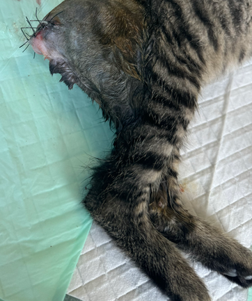 L'histoire de NOUKI : Sauvetage. Prise en charge de ce chaton qui s'était réfugié dans un jardin à Chartres. Il saignait de l'arrière, blessé sévèrement à la base de la queue (coupure). Il a été hospitalisé à la clinique vétérinaire de l'association le 20 août 2024. Malheureusement le vétérinaire n'a pas pu éviter l'amputation de la queue qui était coupée, nécrosée et les asticots étaient déjà dans la plaie. Il a été amputé vendredi 25 août 2024.