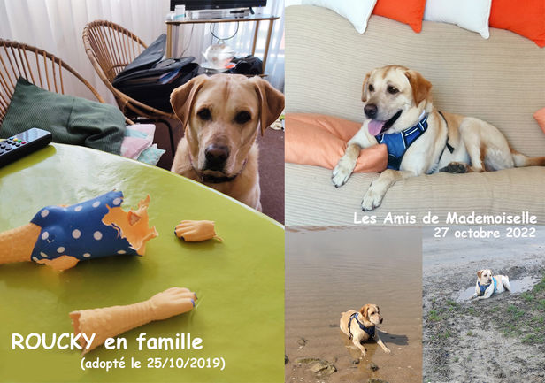 ROUCKY a été adopté le 25 octobre 2019 par Nicole et Thierry. ROUCKY, mâle, Labrador (non LOF) Né le 25 mars 2013. Il est pucé et vacciné. Il a été castré le vendredi 7/9/18. Il pèse 28 kilos. Up Date du 5/10/18. ROUCKY est sociable avec ses congénères, très joueur et à l'écoute. Il adore les longues balades (il tire un peu au début). Il est joueur et câlin. C'est un bon gardien qui peut aboyer pour prévenir mais sans excès. A son arrivée il était très curieux avec le chat de la maison mais avec de la patience et quelques explications il cohabite maintenant sans problème avec lui. Il a manqué d'éducation, il est assez craintif quand on lève la voix et à tendance à s'aplatir vite. C'est un bavard qui adore exprimer ses émotions et qui sait parfaitement se faire comprendre. Il est très gourmand et l'heure de la bouffe c'est sacré ! J'ai récupéré ROUCKY le mercredi 5 septembre 2018 dans son ancienne famille qui désirait s'en séparer en urgence à cause de l'arrivée d'un bébé. Je ne connais pas encore vraiment ses ententes et son caractère sauf ce qui m'a été dit par son ancienne maîtresse. Un chien un peu foufou mais gentil. Il ne connaît pas les chats. Il a toujours été le seul chien de la famille mais s'entend bien avec ses congénères s'ils sont sympas. Par sécurité et/ou facilité, la future famille de ROUCKY sera sans chat et sans enfant en bas âge. En famille d'accueil dans le 28130 (Eure et Loir). L'histoire de ROUCKY : c'est un abandon suite à l'arrivée d'un bébé dans sa famille. ROUCKY est sous contrat Les Amis de Mademoiselle. Téléphone : 06 09 76 61 77 (Merci de laisser un message clair et précis avec vos coordonnées). Adresse électronique : lesamisdemademoiselle@wanadoo.fr Les frais d'adoption sont de XXX €, identifié par puce électronique, vacciné (avec passeport et vaccination anti rabique inclus) et castré. Au contrat d'adoption sera joint un certificat vétérinaire obligatoire avant toute cession (code rural L214-8 et D 214-32-2).